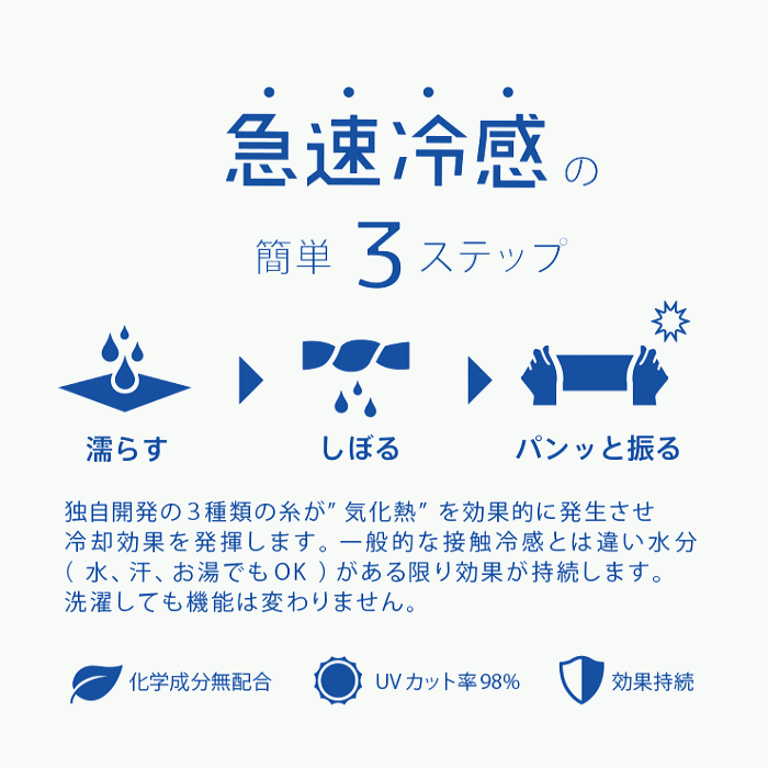 急速冷感の簡単3ステップ 1.濡らす 2.絞る 3.振るだけ 独自開発の3種類の糸が『気化熱』を効果的に発生させ冷却効果を発揮します。